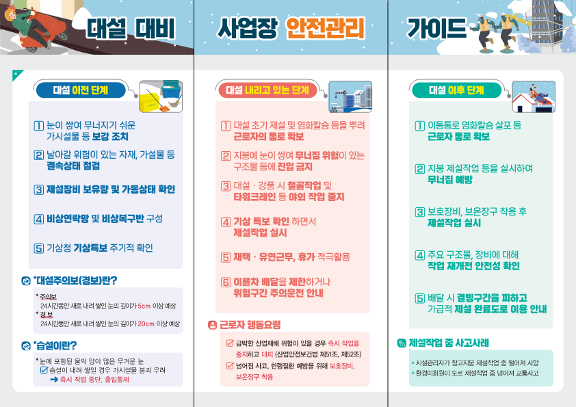 본 저작물은 안전보건공단에서 2024년 작성하여 공공누리 제4유형으로 개방한 '대설 대비 사업장 안전가이드'을 이용하였으며,